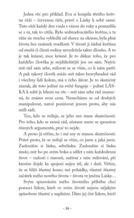 „Jako autorka si přeji,“ svěřuje se Eva Prchalová, „aby má Cesta k Lásce mohla inspirovat a pomáhat. Pomáhat lidem, kteří tápou ve svém životě a hledají nějaký směr právě pro sebe. A tak jako před pár lety i já, hledají ve vnějším světě něco nebo někoho, kdo je udělá šťastnými. A to je právě to ONO! To, na co jsem si ve svém životě přišla a došla k tomu a píšu o tom v této knížce.“