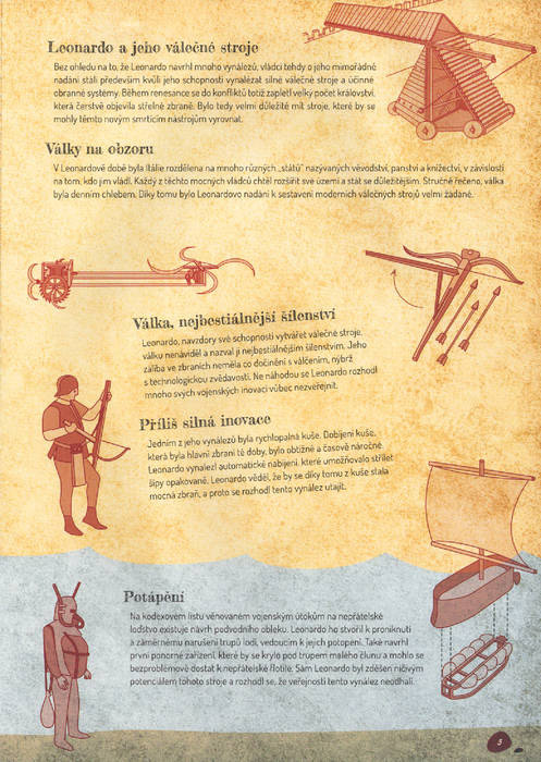 Stroje Leonarda da Vinci – katapult a kuše na několika stránkách představují tohoto významného vynálezce a umělce. Čtenář pozná jeho život a dílo poutavou formou doplněnou o nejrůznější zajímavosti a četné obrázky, které pomáhají text vysvětlit.